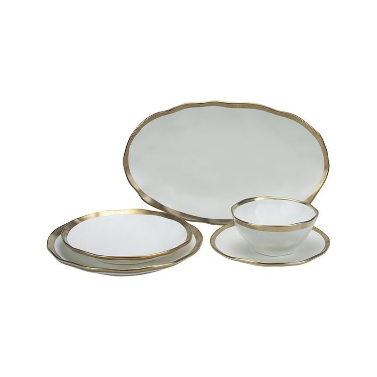 Deze elegante 25-delige serviesset is vervaardigd uit hoogwaardig porselein en afgewerkt met een verfijnde goudkleurige rand. De combinatie van helder wit en subtiele gouden details geeft de set een luxe en tijdloze uitstraling, perfect voor zowel dagelijks gebruik als speciale gelegenheden.