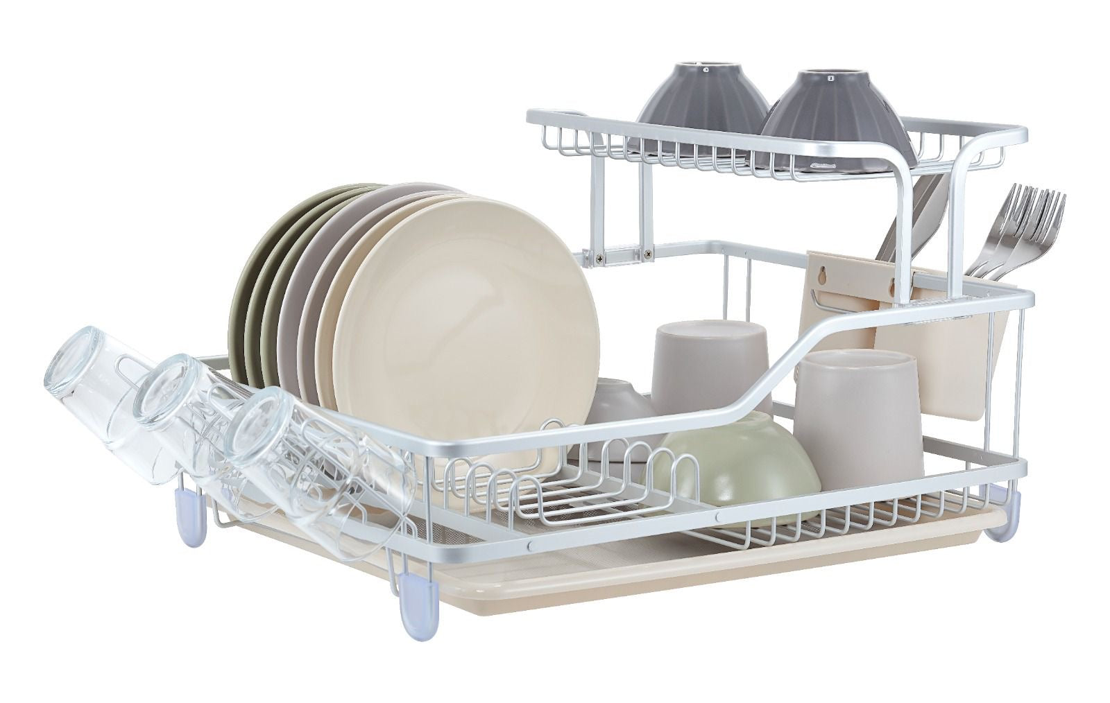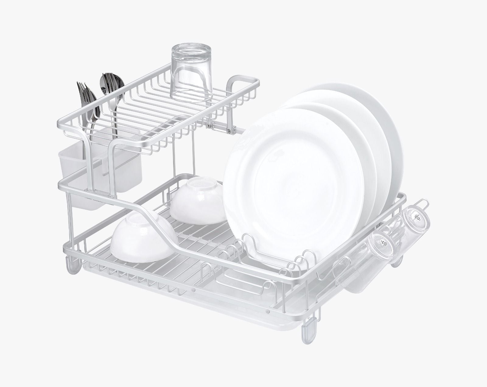 Het tweelaagse ontwerp biedt extra droogruimte zonder veel plaats in te nemen op het aanrecht. Borden, glazen, kommen en kopjes kunnen overzichtelijk worden geplaatst, terwijl het aparte bestekvak zorgt voor een georganiseerde en hygiënische indeling. De geïntegreerde lekbak vangt overtollig water op en houdt het aanrecht schoon en droog.