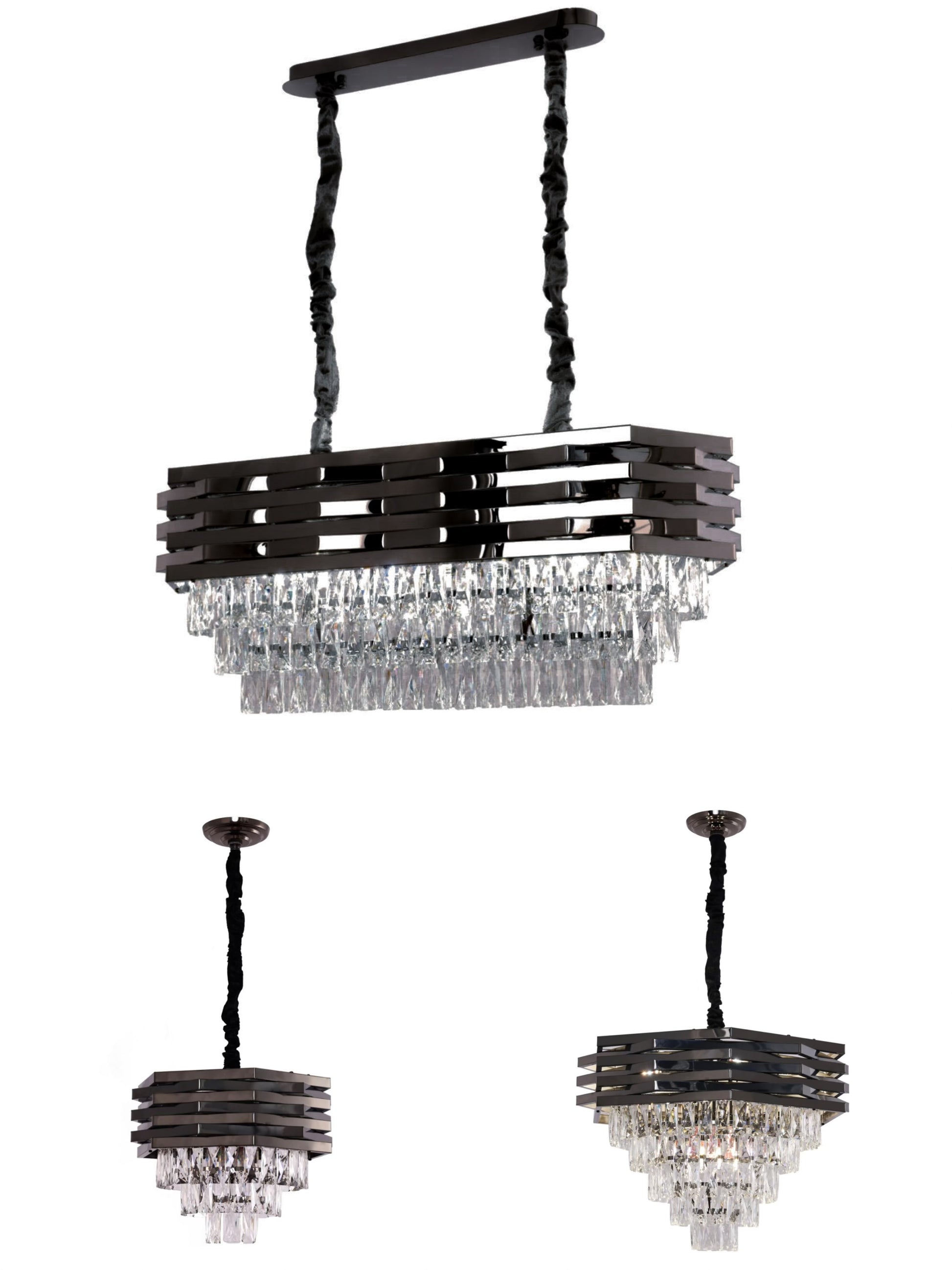 Deze antraciet serie heeft een strak en modern design met meerdere RVS-lagen en een prachtige kristallen waterval. De lampen passen perfect in hedendaagse, luxe en minimalistische interieurs.