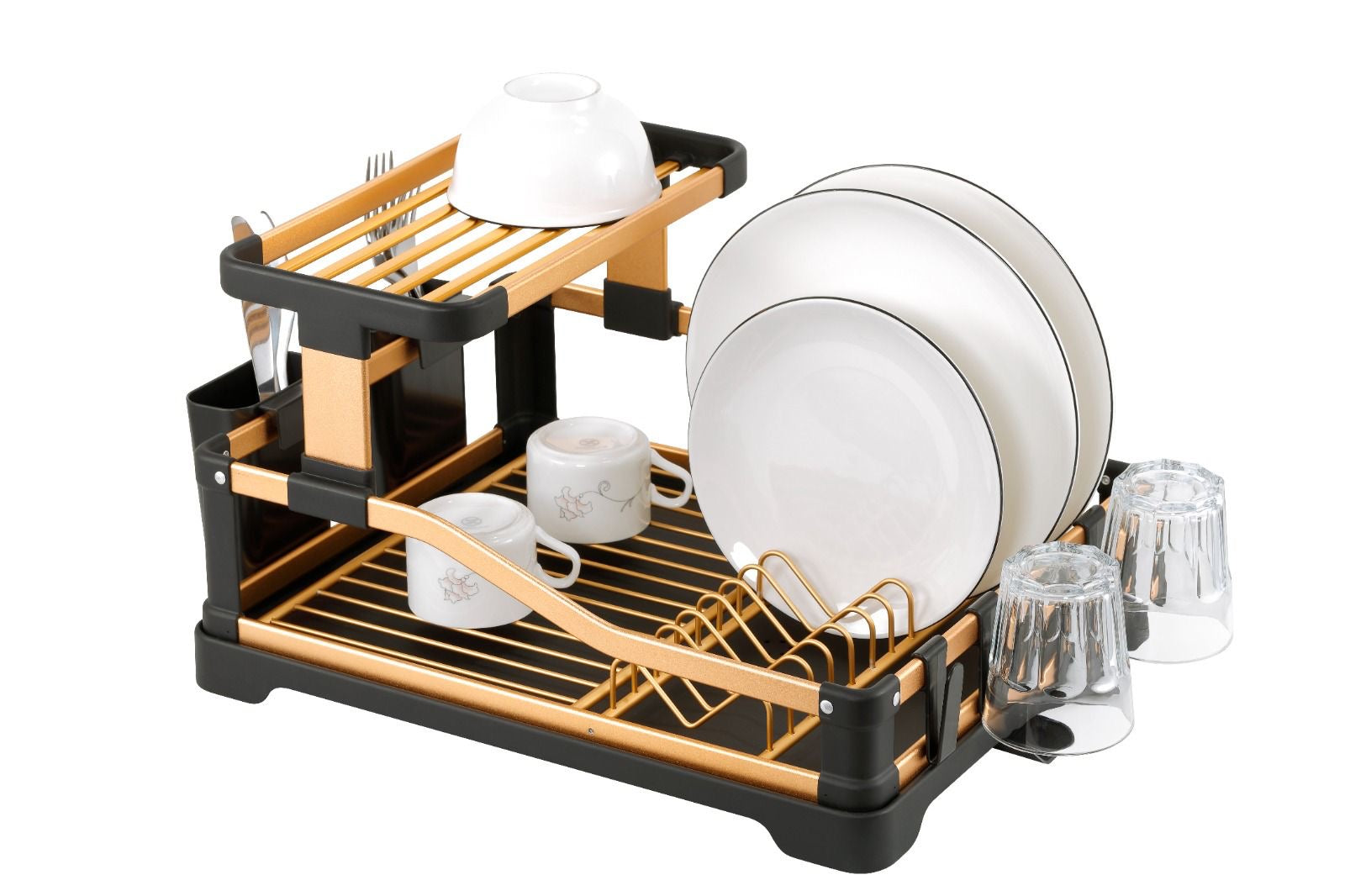 Het tweelaagse ontwerp biedt ruime plaats voor borden, glazen, kopjes en kommen, terwijl het bovenste niveau extra droogruimte creëert zonder extra ruimte op het aanrecht in te nemen. Dankzij het aparte bestekvak blijven messen, vorken en lepels overzichtelijk en hygiënisch gescheiden.
