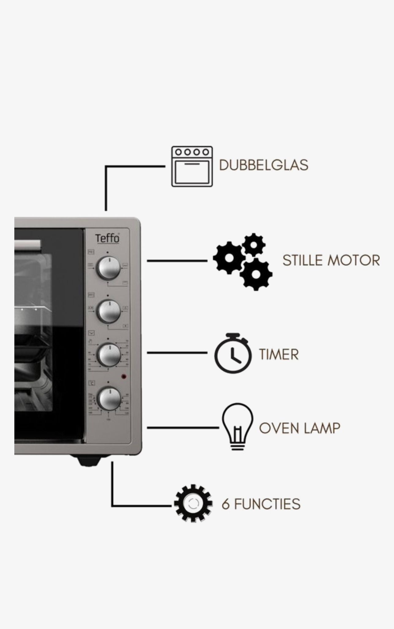 De Teffo 50 liter oven beschikt over 6 verschillende standen, waaronder onder andere hetelucht, ventilator en ontdooifunctie. De ingebouwde timer en ovenverlichting maken het gebruik extra eenvoudig en overzichtelijk.