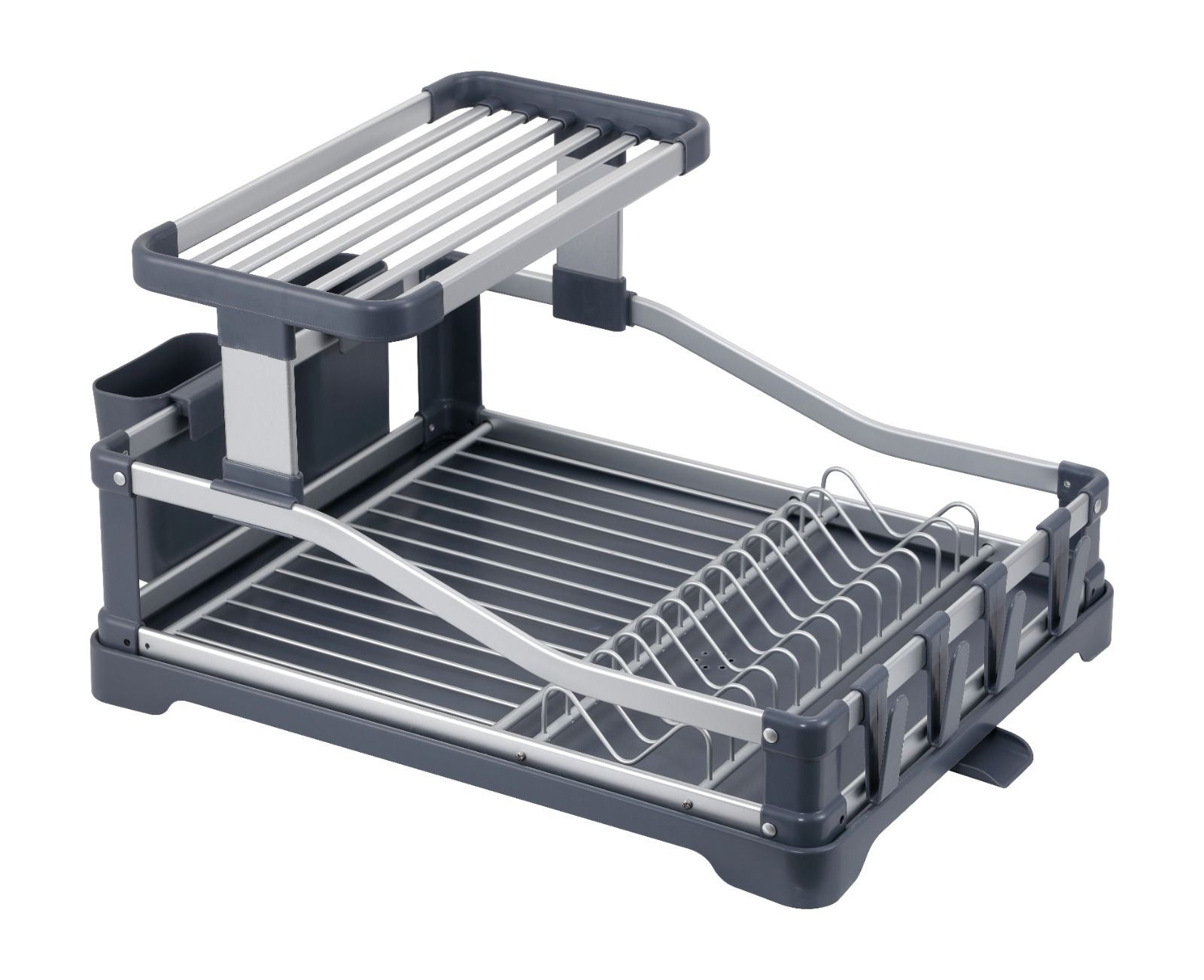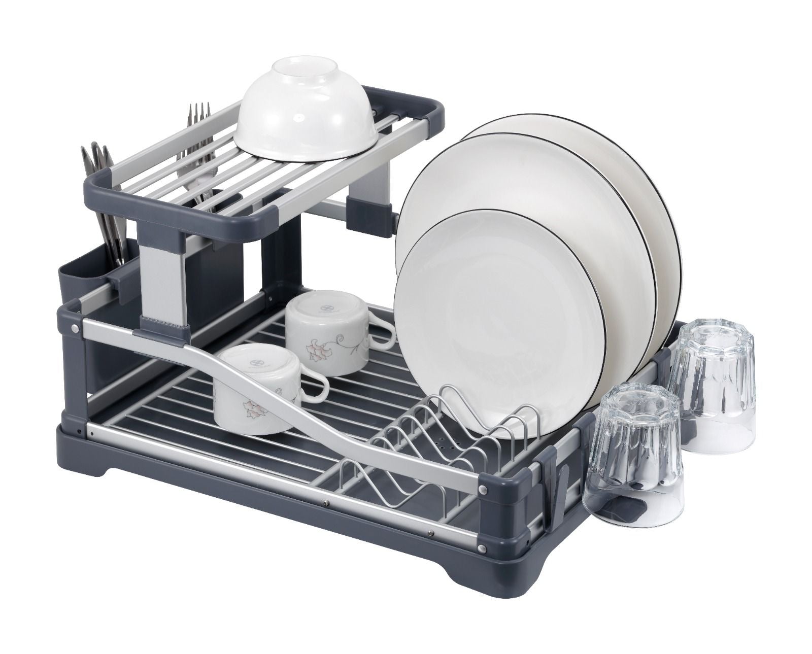 Het tweelaagse ontwerp biedt ruime plaats voor borden, glazen, kopjes en kommen, terwijl het bovenste niveau extra droogruimte creëert zonder extra ruimte op het aanrecht in te nemen. Dankzij het aparte bestekvak blijven messen, vorken en lepels overzichtelijk en hygiënisch gescheiden.